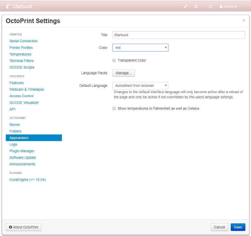 Lo siguiente que hice fue entrar en la configuración de Octoprint, para ajustar las temperaturas a la de los filamentos que suelo usar y personalizarlo un poco poniéndole un nombre a nuestra impresora y seleccionando un color para la barra principal, esto resulta muy útil cuando tienes más de una impresora para no confundirte.
