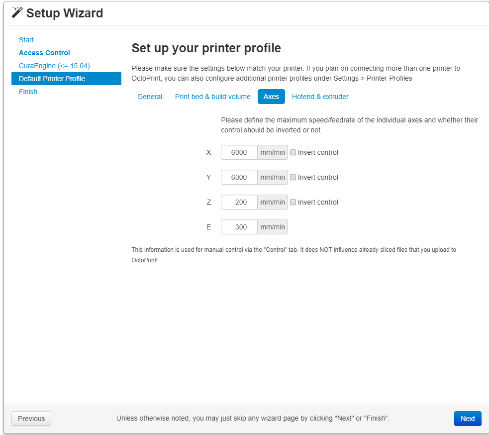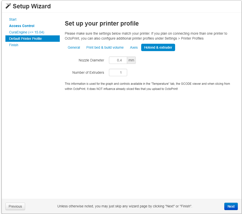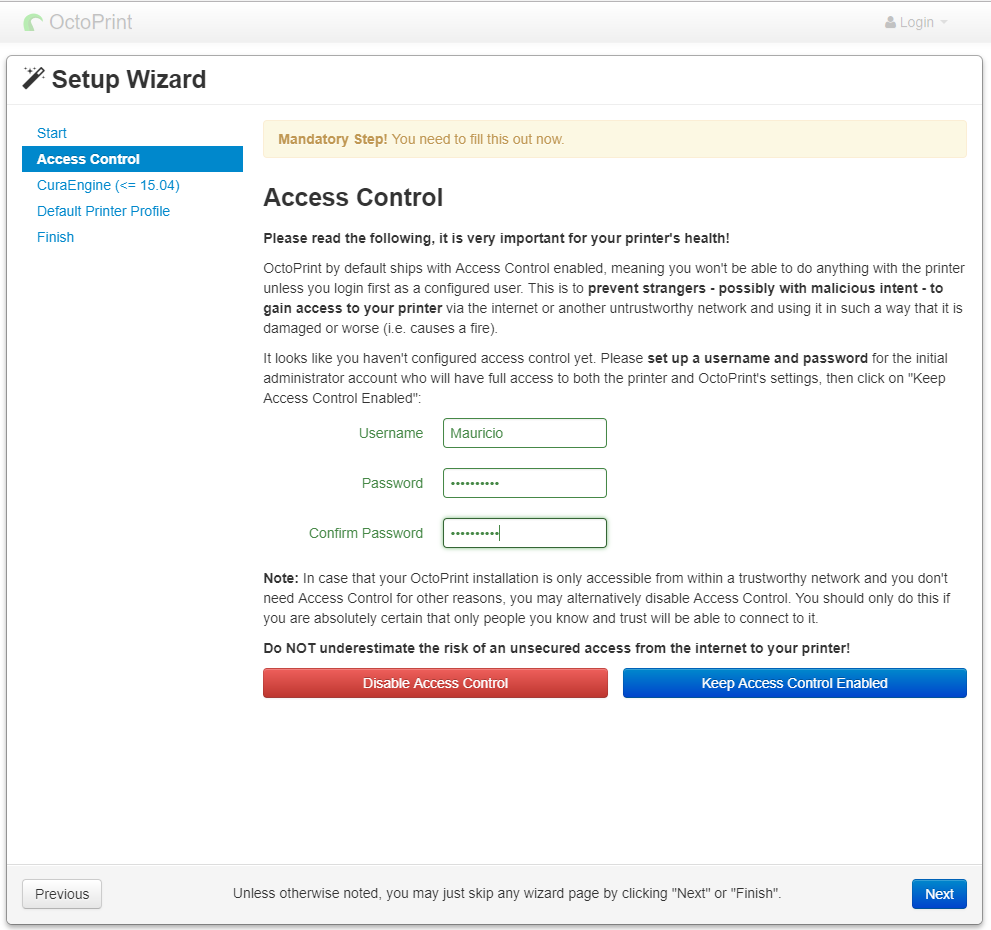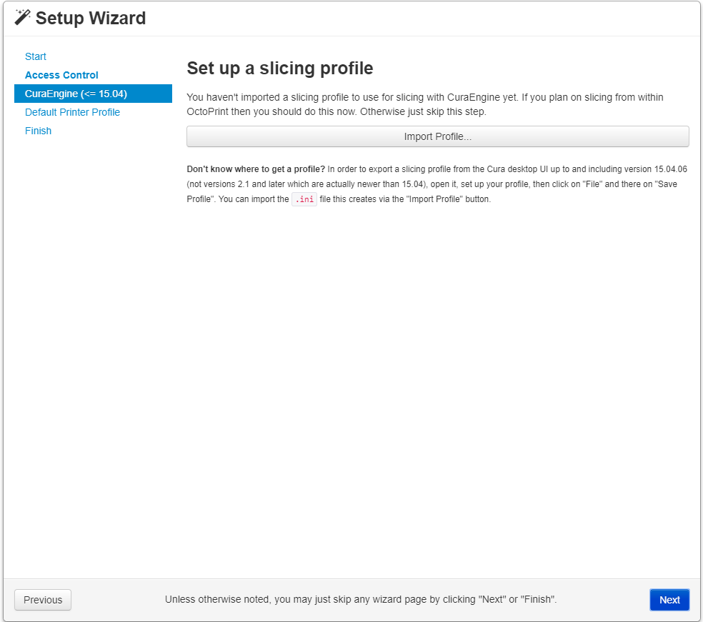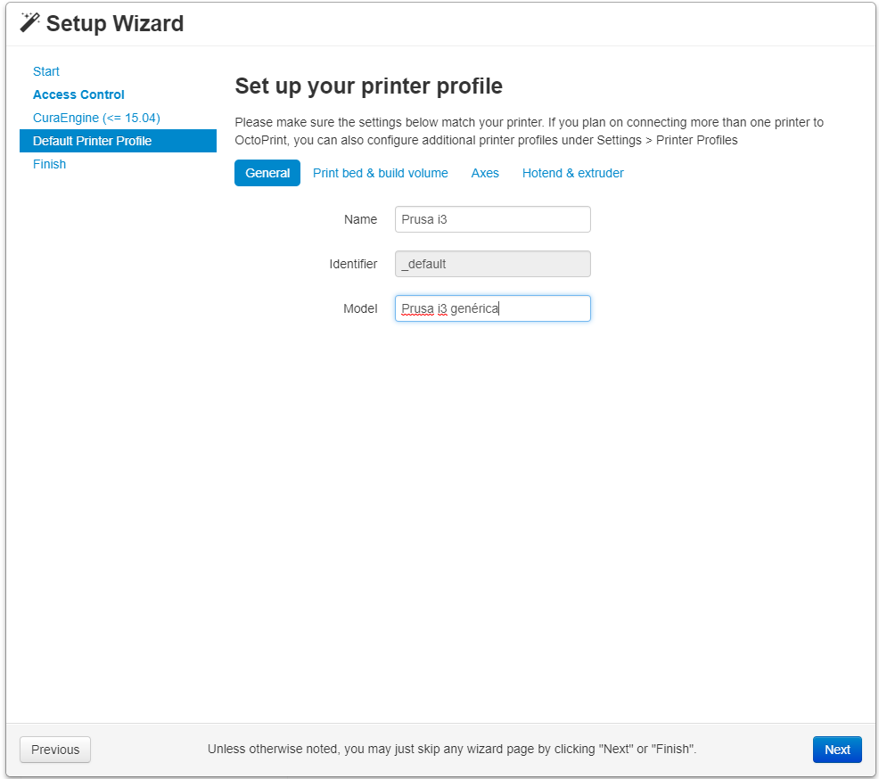 Una vez lo tengáis instalado podréis acceder a vuestro sistema Octoprint desde cualquier navegador web, insertando la dirección http://octopi.local. La primera vez que entréis, os saldrá un pequeño asistente de configuración que consta de los siguientes pasos.
