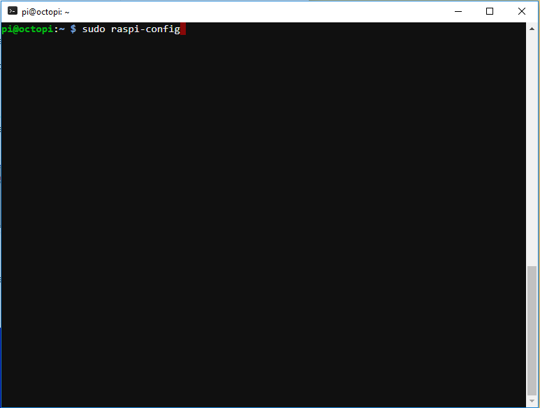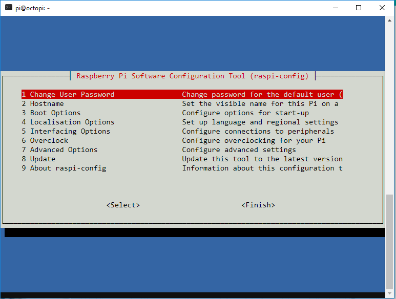 Una vez nos hemos identificado en nuestro servidor, tendremos que introducir el comando que os indico a continuación (sudo raspi-config) para entrar en el menú de configuración básica del sistema operativo Raspbian. Concretamente queremos cambiar la contraseña del usuario a una distinta de la genérica, de forma que cualquiera que pudiera tener acceso a nuestra red no pueda conectarse a nuestro servidor de impresión. Además como paso opcional de personalización, ya que le hemos puesto un nombre a la impresora en la configuración, podemos seleccionar la opción 2, para cambiar el nombre del servidor del genérico Octopi que viene de fábrica al mismo nombre que hayamos seleccionado anteriormente. Una vez se hacen estos cambios si intentamos salir nos pedirá reiniciar la máquina, aceptamos y a partir de ese momento, su dirección dejará de ser octopi.local, y pasará a ser el nombre que le hayáis puesto en la opción 2. en mi caso, puedo acceder a ella a través de http://starbuck.local.